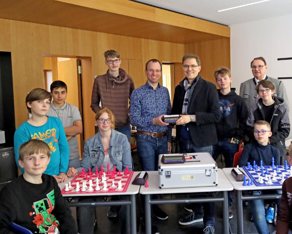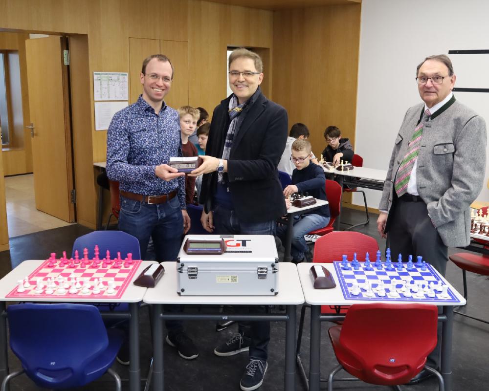 Vor Beginn der Schulmeisterschaft im Schach überreichten Florian Amann (Vorsitzender) und Wolfgang Christ vom Verein der Freunde des Gymnasiums Neustadt/WN einen Koffer mit modernen elektronischen Schachuhren und zwei farbige Figurensätzen im Wert von insgesamt 550€ an den Leiter des Wahlfachs Dr. Markus Frischholz. Der Oberstudienrat freute sich ganz besonders über diese Sachspende: „Ohne die neuen Uhren hätte das Turnier nicht durchgeführt werden können, da nur so der inzwischen übliche Zeitbonus pro Zug möglich ist.“ Und so ließ es sich Florian Amann auch nicht nehmen als Startschuss in das Turnier den symbolisch ersten Zug ausführen. Die größte Freude hatten jedoch sicherlich die teilnehmenden Schülerinnen und Schüler, die mit den neuen Uhren in spannenden Partien um die Schulmeisterschaft kämpfen konnten.
